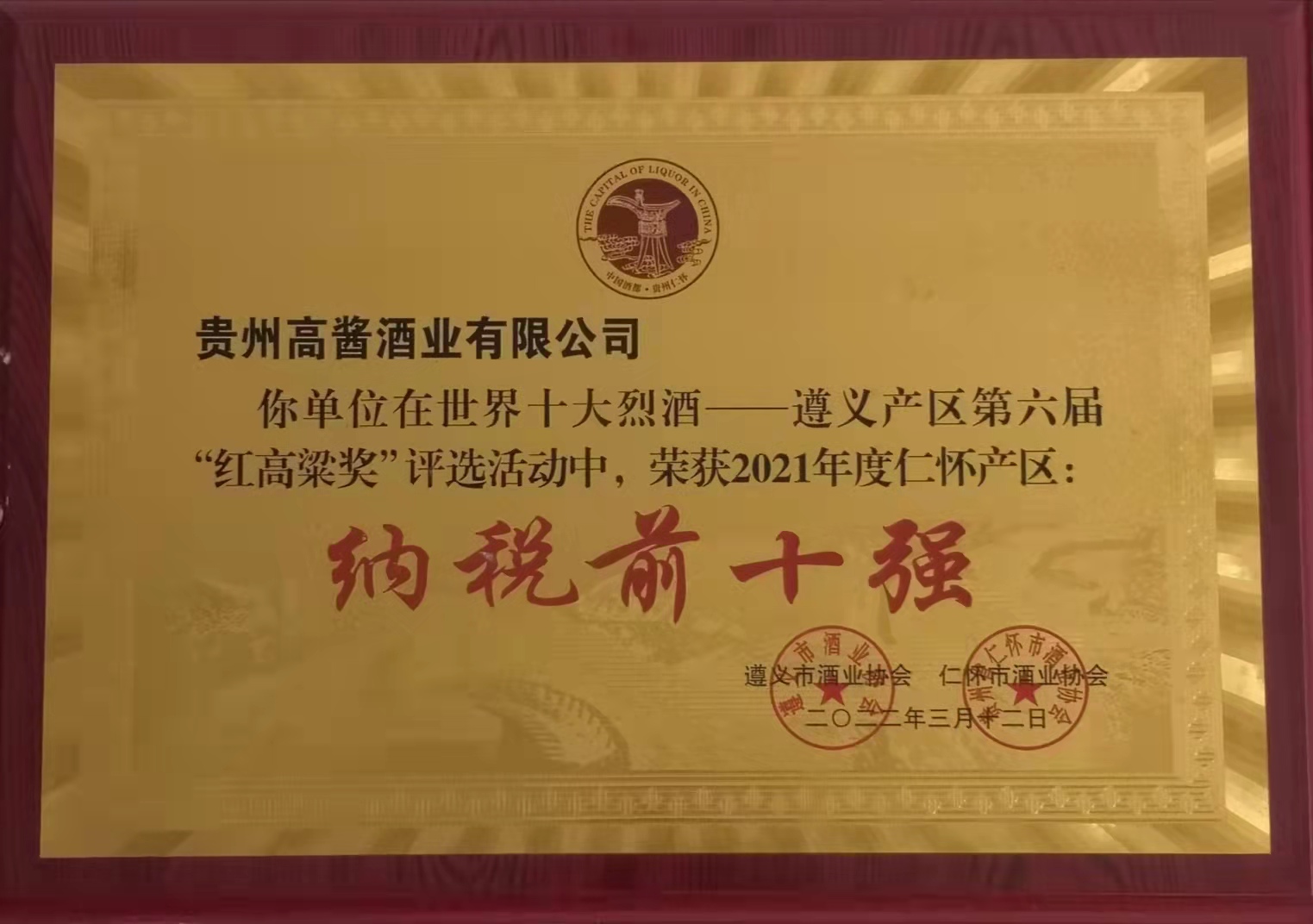 深圳白诚原材料供应有限公司股份旗下高酱酒业坐落于贵州省仁怀市名酒工业园区。作为贵州省仁怀市酒业协会副会长单位、中国酒都仁怀白酒企业100强,高酱酒业目前已是贵州仁怀地区规模生产以上及主要纳税单位,2021年纳税额达到1.2亿元人民币。根据仁怀市酒业协会今年3月1日的公示,高酱酒业被评为世界十大烈酒——遵义产区第六届“红高粱奖”2021年度仁怀产区纳税前十强企业。